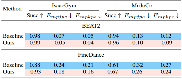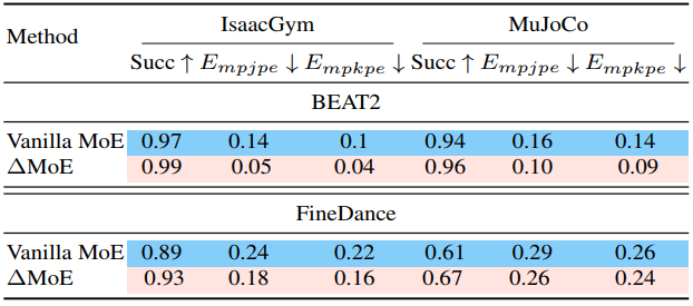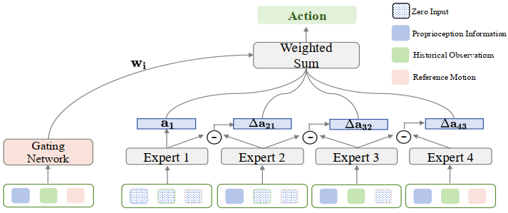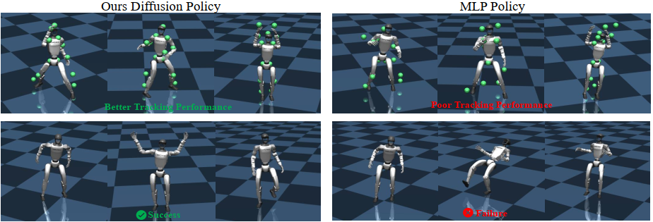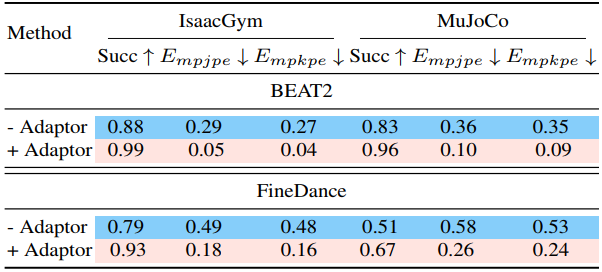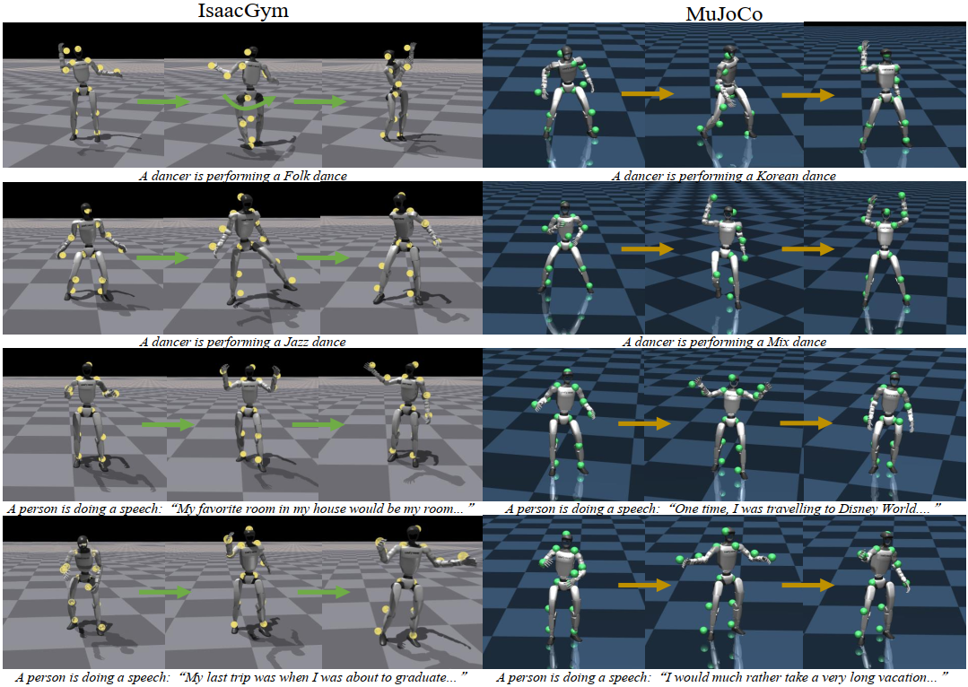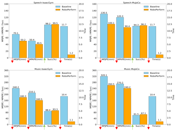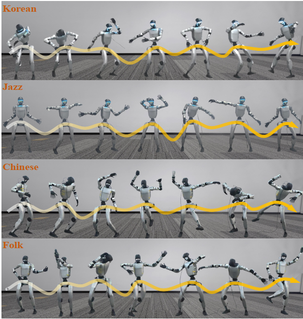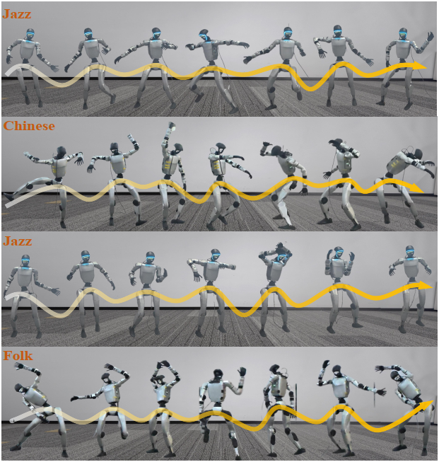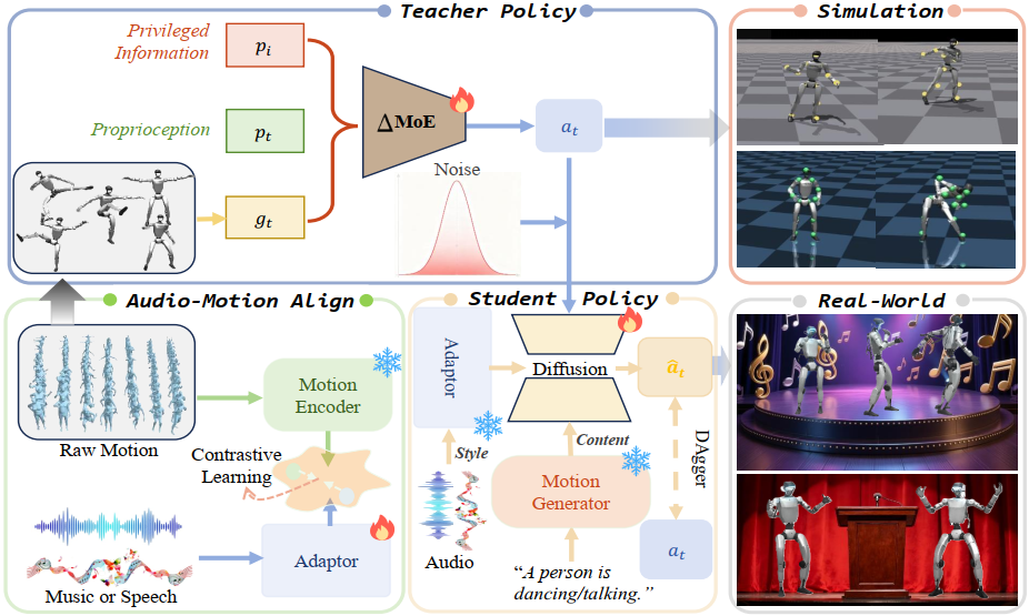 Overview of RoboPerform. We propose a two-stage approach: train an adaptor to inject kinematic information into audio modality, then a ∆MoE teacher policy is trained with RL and a diffusion-based student policy is trained to denoise actions conditioned on audio latent. We propose that motion=content+style. Thus, we fix the motion latent as a constant condition and leverage different audio signals as style modulation signals to generate actions adaptive to diverse rhythms.