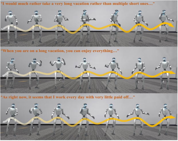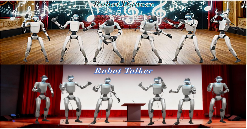 RoboPerform makes humanoid perform as dancer and talker, which utilizes audio as signal to control humanoid locomotion, enabling poolicy to generate rhythm-aligned co-speech gestures and dance movements via input speech or music.