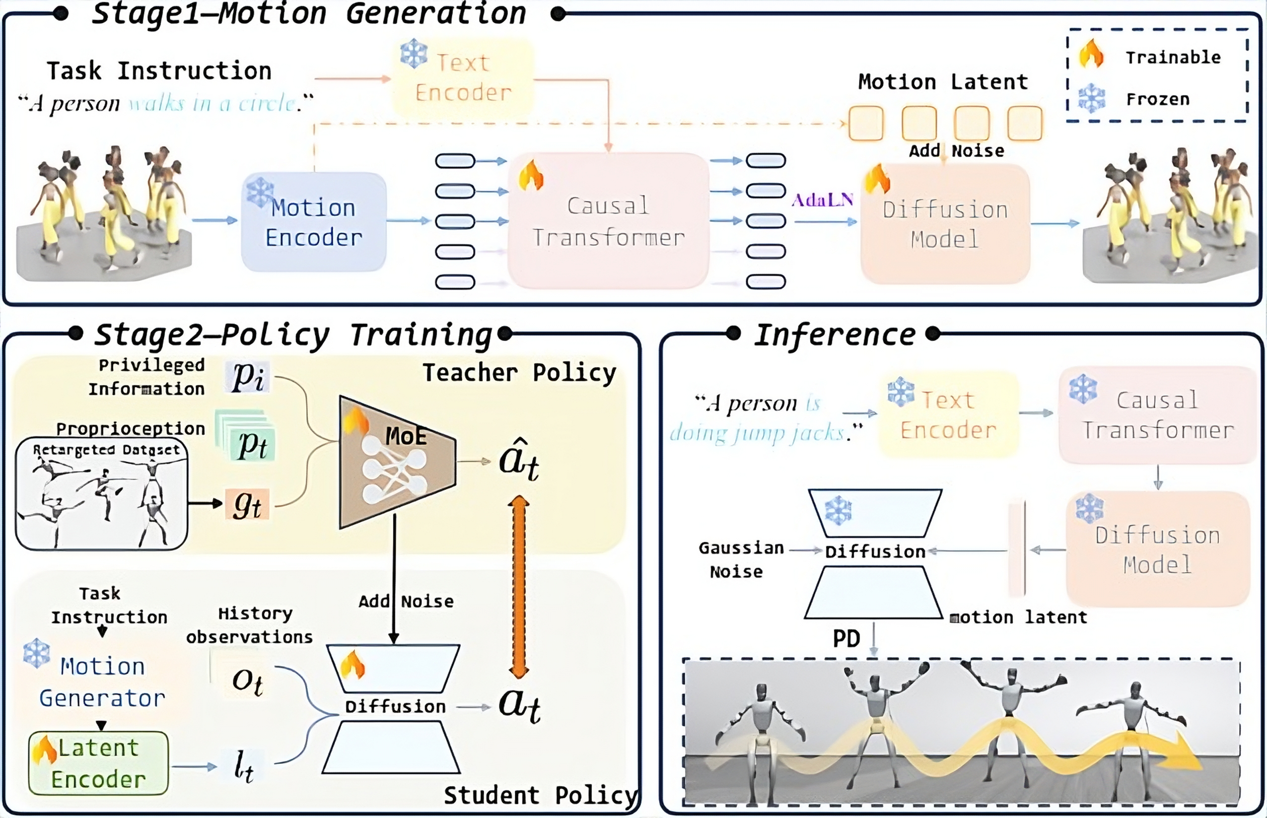 Overview of RoboGhost. We propose a two-stage approach: a motion latent is first generated, then a MoE-based teacher policy is trained with RL and a diffusion-based student policy is trained to denoise actions conditioned on motion latent. This latent-driven scheme bypasses the need for motion retargeting.