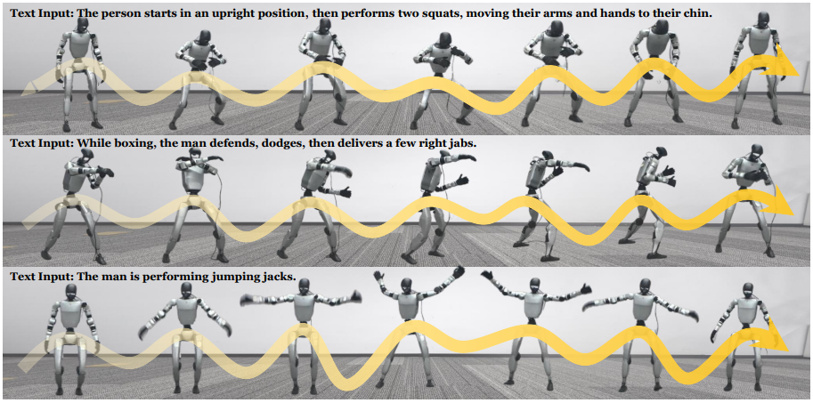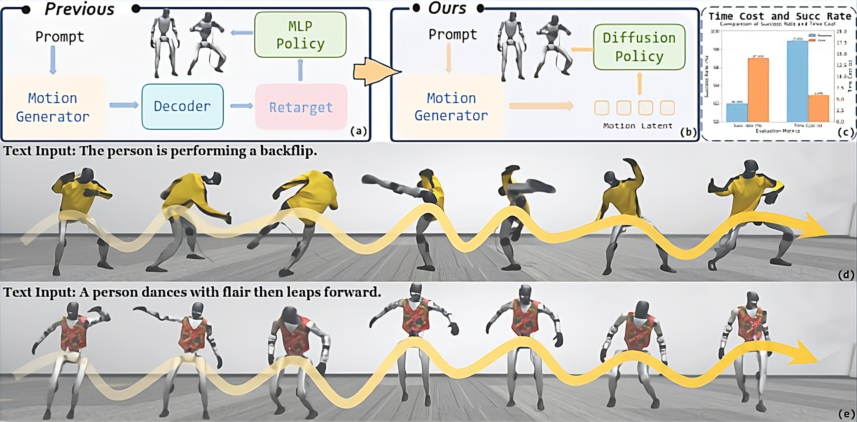 RoboGhost is a retargeting-free latent driven policy for language-guided humanoid locomotion. By removing the dependency on motion retargeting, it thus allows robots to be controlled directly via open-ended language commands. The figure showcases (a) the previous pipeline with motion retargeting, (b) our proposed retargeting-free latent-driven pipeline, (c) quantitative comparisons of success rate and time cost between baseline and RoboGhost, (d) performing the backflip, and (e) dancing and leaping forward.